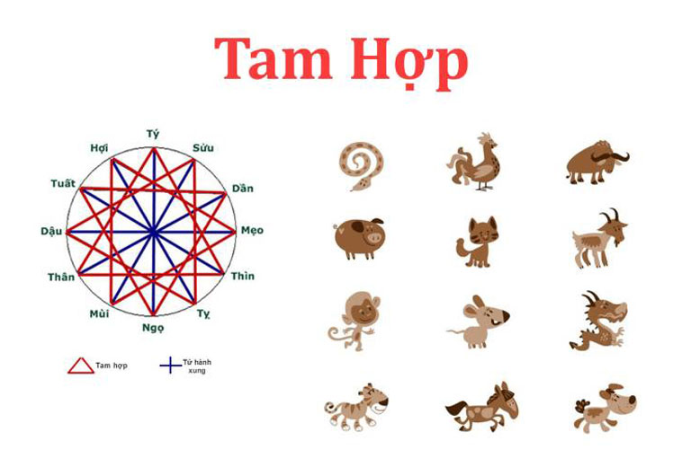 Tổng cộng có 4 nhóm tam hợp, mỗi nhóm gồm 3 con giáp với những đặc điểm tương đồng về tính cách và có liên quan mật thiết đến nhau. Thường là chung chí hướng và lí tưởng, có thể giúp đỡ nhau để cùng phát triển và đạt được thành công trong công việc, cuộc sống.