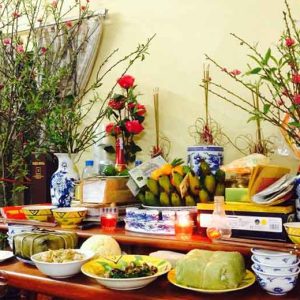 Một mâm cúng cơ bản bản thường có: một con gà trống còn nguyên, xôi hoặc bánh chưng, canh, rượu trắng. Những món ăn còn lại xuất hiện trên mâm cúng tùy thuộc vào nhu cầu mỗi gia đình: tôm hấp sả, chả nem, thịt bò xào,…
